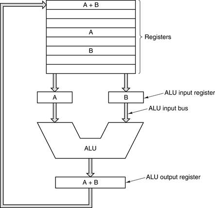 Схема работы процессора на примере суммы(Э. Таненбаум)