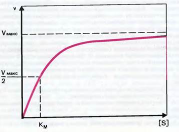 Важной характеристикой любого фермента является константа Михаэлиса. Под этой константой понимается такая концентрация субстрата, при которой скорость ферментативной реакции составляет половину от возможно максимальной концентрации. При малых количествах субстрата скорость ферментативной реакции пропорциональна его концентрации. С возрастанием концентрации субстрата ход реакции ускоряется все в меньшей и меньшей степени, а затем становится независимой от нее (выход кривой на плато) и будет уже определяться концентрацией фермента.