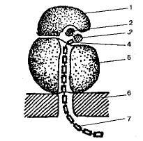 Схема строения рибосомы: 1 - малая субъединица; 2 - иРНК; 3 - тРИК; 4 - аминокислота; 5 - большая субьединица; 6 - мембрана эндоплазматической сети; 7 - синтезируемая полипептидная цепь.