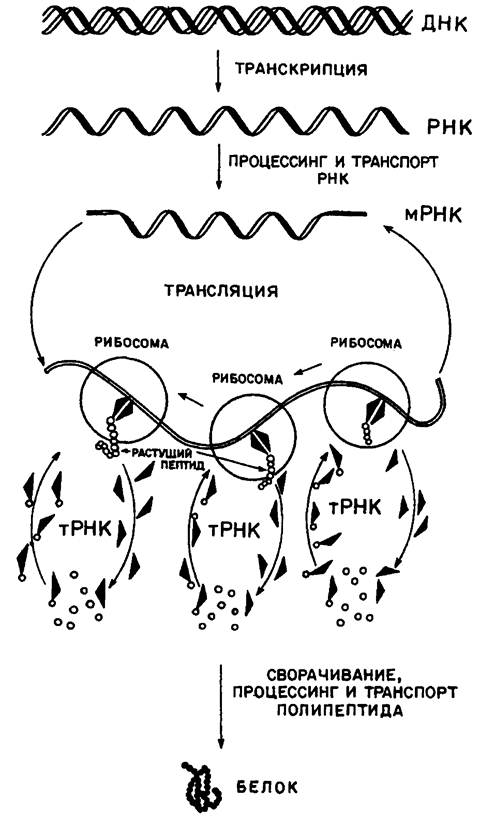 Ниже приведена упрощенная схема биосинтеза белка. Программа, задающая порядок чередования аминокислот в синтезируемом белке, находится в ДНК. Отдельные участки ДНК, называемые генами, являются матрицами для синтеза на них однотяжевых цепей РНК. Синтезированные РНК комплементарны одной из цепей ДНК. Такой процесс копирования гена осуществляется ферментом РНК-полимеразой и называется транскрипцией. В течение синтеза и особенно после него РНК подвергается ряду дополнительных изменений - процессингу, в результате чего формируется информационная или «мессинджер» РНК (иРНК или мРНК). Такая РНК является программой аминокислотной последовательности синтезируемого белка.