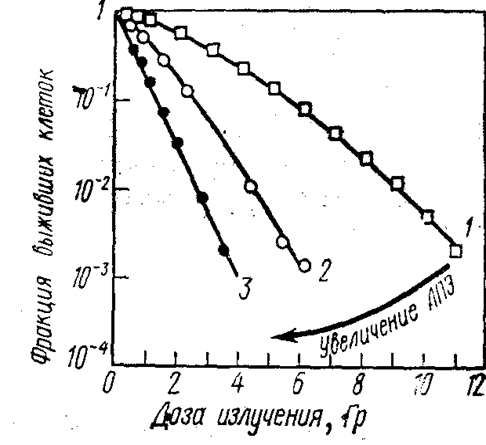 Кривые выживаемости клеток, облученных равными дозами разных ионизирующих излучений (рис. 18), также разнятся: по мере роста ЛПЭ увеличивается наклон кривых, сокращается плечо репарации, уменьшается экстраполяционное число, достигая единицы при a-облучении. Следовательно, с ростом ЛПЭ повышается поражаемость клеток и снижается их способность к восстановлению.