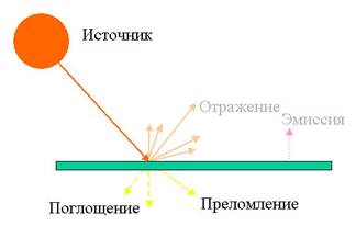 Направленный на поверхность Земли поток (φ1) ЭМИ (энергии) вступает во взаимодействие с веществами на поверхности Земли. Различают следующие типы взаимодействия падающего электромагнитного излучения с объектами на поверхности Земли: отражение, рассеивание, абсорбция, трансмиссия и эмиссия.