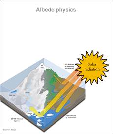 АЛЬБЕДО (лат. albedo — белизна) — способность поверхностей или отдельных тел отражать солнечную радиацию, т.е. отношение отраженного от поверхности потока энергии к падающему на нее потоку. Определяется в долях (%) отраженной радиации от поступающей на поверхность. Самое большое альбедо у снега — 70-90%, что сильно задерживает его таяние, особенно в Заполярье. У песка до 35%, у травяного покрова 20-25%, у лесных крон от 5 до 20%. Наименьшее альбедо у воды — 5% и вспаханных почв (черноземы 5%, подзолы до 20%). Это самые теплоемкие поверхности. Общее альбедо земного шара около 40%.