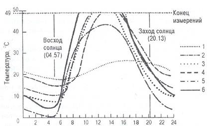 2,5-30. Температуры поверхностей различных материалов в течение суток (Lowe, 1969). 1 –вода в луже; 2 – гравий; 3 – скошенный газон; 4 – бетон; 5 – газон; 6 – крыша дома