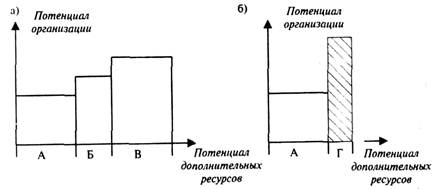При варианте (рис.3.76) соединение хорошо совместимых двух ресурсов А и Г создает такой общий потенциал организации, который существенно перекрывает потенциал, полученный пи объединении трех ресурсов А, Б и В (рис. 3.7а). При этом величина самого ресурса Г существенно меньше суммы ресурсов Б и В.