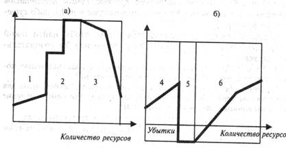 На рис. 3.8а имеются три области (1, 2, 3). Область 1 характеризуется простым увеличением потенциала организации на величину потенциала очередного ресурса. Область 2 характеризуется резким (скачкообразным) увеличением потенциала организации от нескольких ресурсов, при этом приращение потенциала организации существенно больше, чем потенциал каждого введенного ресурса (эффект синергии). Область 3 — это спад, когда в организации работает слишком много людей или техники, а также при внесении новым ресурсом рассогласования между уже имеющимися.
