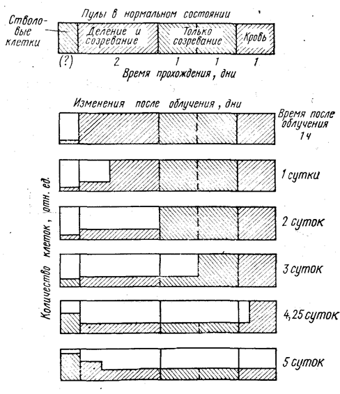 Наиболее кратковременно пребывание в красном костном мозге эритроидного ростка, и поэтому он опустошается быстрее и интенсивнее, чем другие. Дольше всех в красном костном мозге созревают моноциты, и соответственно их росток подавляется в костном мозге в наименьшей степени.