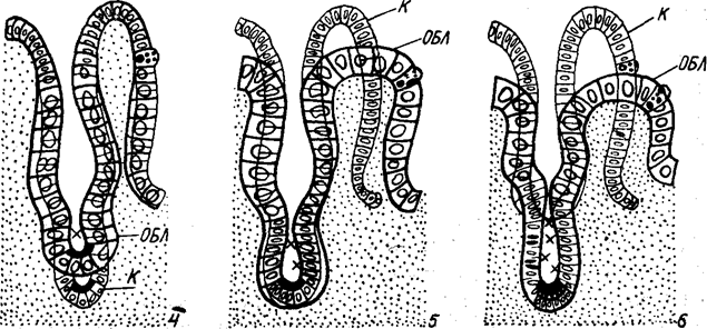 Уход клеток с ворсинок частично компенсируется увеличением размера облученных клеток, крипта изменяет форму и съеживается (рис. 26). Клеточность эпителия достигает минимума, после чего возрастает, приближаясь к нормальному клеточному уровню системы крипта-ворсинка. Если в результате облучения гибнут все стволовые клетки крипты, то подъема клеточности не происходит и крипта гибнет.