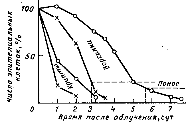 Рис. 27. Потери эпителиальных клеток крипт и ворсинок у мышей после облучения в дозе 30Гр. Штриховой линией выделены зоны, в которых наблюдается понос (По Гозенбук, Кеирим-Маркус, 1988).