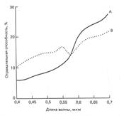 Рис. 7. Спектральные отражательные способности двух типов пород: красного алевролита (А) и выветрелого серого известняка (В (Ray R.G., Fisher W.A., 1960)