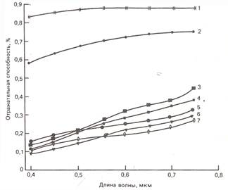 В общем отражательная способность изученных горных пород уменьшается с уменьшением длины волны (рис. 6).