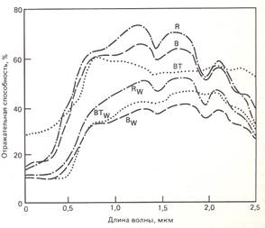 На этом примере выясняется, что: а) различие в отражательной способности двух типов горных пород в определенном интервале длин волн или части спектре выражено сильнее, чем в других; б) отношение отражательных способностей двух типов горных пород в диапазоне видимого излучения может обращаться; в) спектральные характеристики различных горных пород в определенном интервале длин волн могут быть похожи или одинаковы.