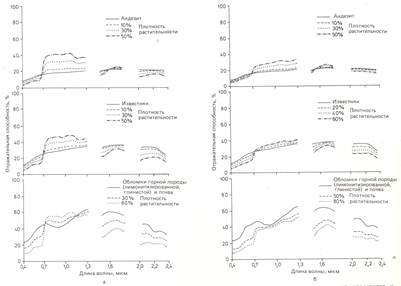 Влияние плотности растительного покрова на величину спектрального отражения андезита, известняка и глиноземистых лимонитизированных выветрелых почв показано на рис. 10. На этих графиках сопоставляется яркость не покрытых растениями и заросших поверхностей горных пород (густота растительности в поле измерения спектрометра выражена в процентах). Как и ожидалось, эффект растительности в спектре отраженного потока энергии четко выражен только для горных пород с незначительным альбедо. Уже при 10% луговых злаков спектральные характеристики андезита и известняка маскируются спектральным сигналом луговой растительности (рис. 10, а). Даже при незначительном растительном покрове была затруднена идентификация спектральных сигналов пород этих двух типов.