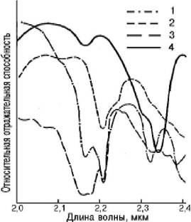 Рис. 12. Спектральная отражательная способность некоторых минералов, встречающихся на участках развития гидротермальных изменений в горных породах (по данным лабораторных измерений [186]). Для определения минералов важным оказалось положение спектральных полос поглощения, 1 – каолинит; 2 – монтмориллонит; 3 – алунит; 4 – кальцит.