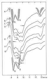 Рассмотрим группу графиков энергии вторичного теплового излучения, полученных при измерениях некоторых грубозернистых свежих измельченных проб гранитов из Новой Англии. Цвет отдельных проб меняется от темно-серого до коричневого, розового или голубоватого. Но различие в цвете, по мнению Лайона и Грина, не влияет на интенсивность эмиттерного излучения. Измерение положения минимума энергии на графиках (рис. 14) вызвано изменениями в минеральном составе проб (химическом модуле) кварцевых гранитов (D и E) и щелочных полевошпатных гранитов (F). Для сравнения приведены оба минимума в спектре излучения кварца (Q).