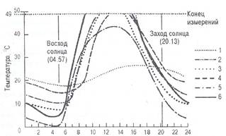 Температуры поверхностей различных материалов в течение суток (Lowe, 1969). 1 –вода в луже; 2 – гравий; 3 – скошенный газон; 4 – бетон; 5 – газон; 6 – крыша дома