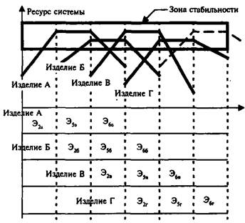 Стабилизация осуществляется включением новой продукции в деятельность организации. Так, не дожидаясь спада продукции А, необходимо включить в деятельность организации новую продукцию Б, а затем аналогично продукцию В и продукцию Г.