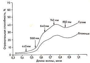 Статистический анализ 200 спектральных кривых позволил предположить, что спектральные характеристики большого числа типов почв фиксируются при съемках ландшафтов в пяти интервалах длин волн, и, следовательно, характерные формы спектральных кривых всех почв могут быть получены из данных этих съемок в пяти «критических» каналах: 0,44; 0,54; 0,64; 0,74 и 0,86 мкм (рис. 22). Значения ближнего и среднего инфракрасных диапазонов для распознавания почв пояснены ранее (рис. 16 и 17).