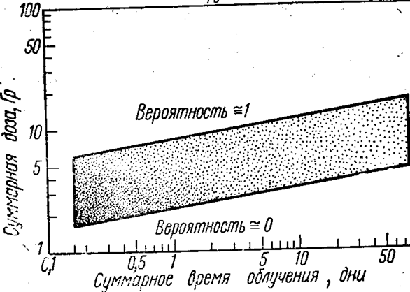 Рис. 32. Зависимость катарактогенной дозы для человека от мощности дозы (по Ярмоненко, 1984)