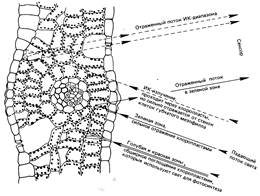 Общая схема взаимодействия падающего потока ЭМИ с живым листом приведена на рисунке 3.13. Как видно из схемы, голубая и красная зоны спектра поглощаются, а зеленая часть спектра отражается хлоропластами, и это определяет зеленый цвет растительности. ИК-излучение проходит через хлоропласта, но сильно отражается от клеток губчатого мезофилла.