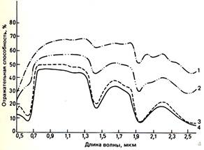 Рис. 34. Спектральная отражательная способность листьев с различным содержанием воды (кукурузные листья) [115]: 1 – <40%; 2 – 40-54%; 3 – 54-66%; 4 – >66%.