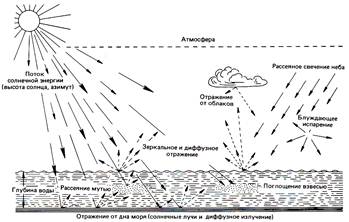 Отражающие, пропускающие и поглощающие характеристики вод определяются их мутностью, наличием взвеси и планктона, солёностью, температурой и др. Процессы взаимодействия вод и ЭМИ очень сложны. Важным является также то, что на ЭМИ действуют процессы как при проникновении в толщу воды, так и обратно при выходе из толщи (рис. 3.20).