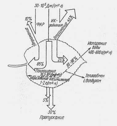 Рассмотрим, как складывается энергетический баланс листа в умеренной зоне. В летний полдень приход солнечной радиации составляет около 30-105 Дж/(м2·ч). В среднем листья поглощают 80-85 % энергии фотосинтетически активной радиации (ФАР), которой является видимая часть спектра электромагнитного излучения с длиной волны 400 - 700 нм, и 25 % энергии инфракрасных лучей, что составляет около 55 % энергии общей радиации, или 16,5-105 Дж/(м2·ч). Лист отражает 10 % ФАР и 45 % инфракрасных лучей и пропускает соответственно 5 и 30 %. На фотосинтез используется 1,5-2 (до 3) % поглощенной фотосинтетически активной радиации, остальная поглощенная энергия расходуется в основном на испарение воды - транспирацию (95- 98 %), возможен также и теплообмен с атмосферой.