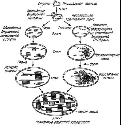 Возникновение и развитие хлоропластов. Хлоропласты образуются в меристематических клетках из инициальных частиц или зачаточных пластид. Инициальная частица состоит из амебоидной стромы, окруженной двухмембранной оболочкой. По мере роста клетки инициальные частицы увеличиваются в размере и приобретают форму двояковыпуклой линзы, в строме появляются небольшие крахмальные зерна. Одновременно внутренняя мембрана начинает разрастаться, образуя складки (впячивания), от которых отшнуровываются пузырьки и трубочки. Такие образования называют пропластидами. Для дальнейшего их развития необходим свет. В темноте же формируются этиопласты, в которых образуется мембранная решетчатая структура - проламеллярное тело. На свету внутренние мембраны пропластид и этиопластов образуют гранальную систему. Одновременно с этим также на свету в граны встраиваются вновь образованные молекулы хлорофилла и других пигментов. Таким образом, структуры, которые подготавливаются к функционированию на свету, появляются и развиваются только при его наличии.