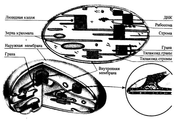 Строение хлоропластов. Строение хлоропласта, обнаруживаемое с помощью электронного микроскопа, весьма сложное. Подобно ядру и митохондриям хлоропласт окружен оболочкой, состоящей из двух липопротеидных мембран. Внутреннюю среду представляет относительно однородная субстанция - матрикс, или строма, которую пронизывают мембраны - ламеллы. Ламеллы, соединенные друг с другом, образуют пузырьки - тилакоиды. Плотно прилегая друг к другу, тилакоиды образуют граны, которые различают даже под световым микроскопом. В свою очередь, граны в одном или нескольких местах объединены друг с другом с помощью межгранных тяжей - тилакоидов стромы. Пигменты хлоропласта, участвующие в улавливании световой энергии, а также ферменты, необходимые для световой фазы фотосинтеза, вмонтированы в мембраны тилакоидов.