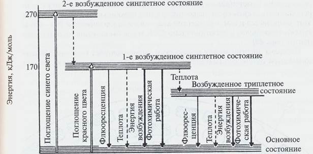 Известно два основных типа возбужденных состояний - синглетные и триплетные. Они отличаются по энергии и состоянию спина электрона. В синглетном возбужденном состоянии спины электронов на основном и возбужденном уровнях остаются антипараллельными, при переходе в триплетное состояние происходит поворот спина возбужденного электрона с образованием бирадикальной системы. При поглощении фотона молекула хлорофилла переходит из основного (S0) в одно из возбужденных синглетных состояний – S1 или S2, что сопровождается переходом электрона на возбужденный уровень с более высокой энергией. Возбужденное состояние S2 очень нестабильно. Электрон быстро (в течение 10-12 с) теряет часть энергии в виде тепла и опускается на нижний колебательный уровень S1, где может находиться в течение 10-9 с. В состоянии S1 может произойти обращение спина электрона и переход в триплетное состояние Т1, энергия которого ниже S1.