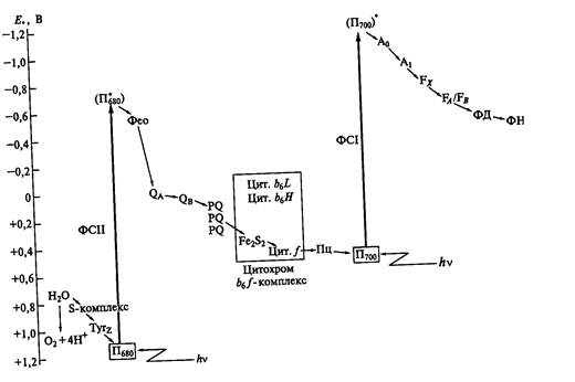 Представления о фотосинтезе, в ходе которого выделяется кислород, формировалось под влиянием Z-схемы электронного транспорта Р. Хилла и Ф. Бенделла. Эта схема была представлена на основе измерения окислительно-восстановительных потенциалов цитохромов в хлоропластах. Электрон-транспортная цепь является местом превращения физической энергии электрона в химическую энергию связей и включает ФС I и ФС II. Z-схема исходит из последовательного функционирования и объединения ФСII с ФСI.