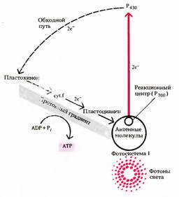 Выбитый из молекулы П700 электрон захватывается белком, содержащим железо и серу, и передается на ферредоксин. В дальнейшем путь этого электрона может быть двояким. Один из этих путей состоит из поочередного переноса электрона от ферредоксина через ряд переносчиков снова к П700. Затем квант света выбивает следующий электрон из молекулы П700. Этот электрон доходит до ферредоксина и снова возвращается к молекуле хлорофилла. Явно прослеживается цикличность процесса. При переносе электрона от ферредоксина энергия электронного возбуждения идет на образование АТФ из АДФ и НзР04. Этот вид фотофосфорилирования назван Р. Арноном циклическим. Циклическое фотофосфорилирование теоретически может протекать и при закрытых устьицах, ибо для него обмен с атмосферой необязателен.