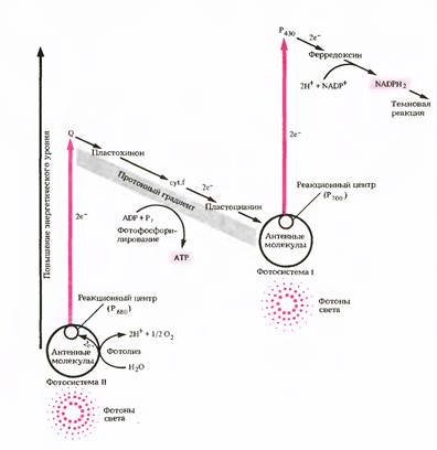Нециклическое фотофосфорилирование протекает с участием обеих фотосистем. В этом случае выбитые из П700 электроны и протон Н+ доходит до ферредоксина и переносятся через ряд переносчиков (ФАД и др.) на НАДФ с образованием восстановленного НАДФ·Н2. Последний, как сильный восстановитель, используется в темновых реакциях фотосинтеза. Одновременно молекула хлорофилла П680, поглотив квант света, также переходит в возбужденное состояние, отдавая один электрон. Пройдя через ряд переносчиков, электрон восполняет электронную недостаточность в молекуле П700. Электронная же «дырка» хлорофилла П680 восполняется за счет электрона от иона ОН- - одного из продуктов фотолиза воды. Энергия электрона, выбитого квантом света из П680, при переходе через электрон-транспортную цепь к фотосистеме 1 идет на осуществление фотофосфорилирования. При нециклическом транспорте электронов, как видно из схемы, происходит фотолиз воды и выделение свободного кислорода.