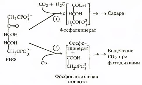 В присутствии кислорода на свету РДФ-карбоксилаза присоединяет к РДФ не СО2, а О2. Присоединив кислород, РДФ распадается на одну молекулу ФГК и одну молекулу фосфогликолевой кис лоты, которая, отщепляя остаток фосфорной кислоты, превращается в гликолевую и из хлоропластов переходит в пероксисомы. Здесь гликолевая кислота окисляется в глиоксилевую с образованием пероксида. Образующаяся перекись водорода распадается на воду и свободный кислород. Глиоксилевая кислота, реагируя с глутаминовой кислотой, трансаминируется в глицин, который покидает пероксисомы и в митохондриях превращается в другую аминокислоту - серин: из двух молекул глицина образуется одна молекула серина и выделяется одна молекула СО2. Вследствие этого часть зафиксированного в фотосинтезе углерода теряется растением.