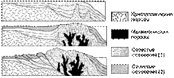 СТАДИИ ОРОГЕНЕЗА в Аппалачах: начальная - накопление осадков в вытянутом океаническом прогибе - геосинклинали (вверху). Внедрение интрузий магматических пород (в середине) приводит к поднятию первичных толщ осадочных пород и образованию гор, при этом продолжается осадконакопление. Впоследствии в поднятие вовлекаются и более молодые отложения (внизу), которые при этом испытывают складчатые и разрывные деформации.