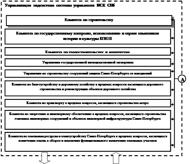 Комитет по строительству в настоящее время действует как основной комитет в системе управления ИСК. Это 2-й уровень управления в системе управления городом. Комитет по строительству взаимодействует не только с комитетами, подразделениями и управлениями, находящимися в подчинении у Вице- губернатора, курирующего вопросы капитального строительства и реконструкции, но и комитетами и службами, подчиненными другим вице-губернаторам (например, Комитет по благоустройству и дорожному хозяйству, комитет по транспорту, подчиненные Вице-губернатору Санкт-Петербурга, отвечающему за решение вопросов городского хозяйства, жилищной политики Санкт-Петербурга, жилищно-коммунального хозяйства).