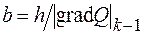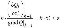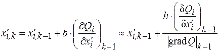 3) Осуществляется поиск внутри допустимой области изменения параметров с рабочим шагом h. Для совершения очередного k -го шага в направлении градиента Q параметры объекта проектирования (координаты изображающей точки) преобразуются следующим образом: