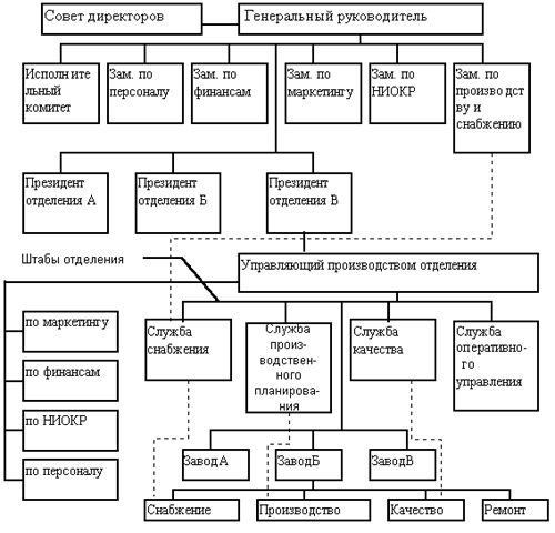 Еще одной разновидностью бюрократического типа является структура, которая в зарубежной литературе получила название дивизионной. Формирование этого вида структур за рубежом связано с процессами разукрупнения гигантских корпораций в 60-е годы. Стремясь повысить гибкость и адаптивность, крупнейшие компании начали выделять из своего состава производственные отделения с предоставлением им определенной самостоятельности в осуществлении оперативного управления. При этом все важнейшие функции управления остаются в ведении центрального аппарата управления, который разрабатывает стратегию развития организации в целом, решал проблемы инвестирования, научных исследований и разработок.