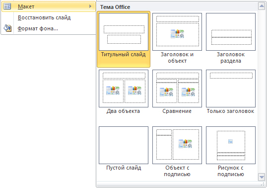 При вставке в презентацию нового слайда, к нему автоматически применяется макет. Макет можно выбрать перед вставкой слайда. Чтобы одновременно с добавлением слайда в презентацию выбрать макет нового слайда в стартовом окне программы Office PowerPoint 2010 на вкладке Главная щелкните на кнопке рядом со значком Создать слайд. Появится коллекция эскизов различных доступных макетов слайдов (рис. 2.6).