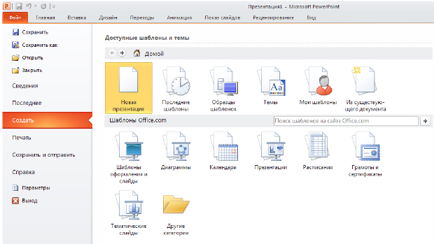 В PowerPoint 2010 для создания новых презентаций имеются шаблоны, которые применяются для продуманной организации элементов и цветов, шрифтов, эффектов, стилей и макетов. Шаблоны позволят ускорить создание новых презентаций.