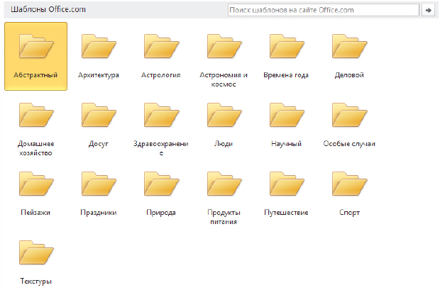 · Для загрузки новых шаблонов из Интернет щелкните на значок Шаблоны оформления и слайды. Откроется подгруппа Шаблоны Office.com (рис. 2.12). Здесь выберите нужную категорию шаблонов и нажмите на кнопку Загрузить для загрузки шаблона с веб-сайта Office.com на локальный диск.