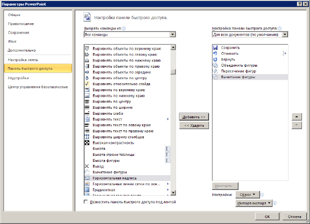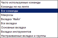 Для использования действий с произвольными фигурами добавьте их на ленту или на панель быстрого доступа. Для этого перейдите на вкладку Файл, откройте представление Backstage и щелкните на раздел Параметры. На вкладке Настройка ленты или Настройка панели быстрого доступа выберите из списка Выбрать команды пункт Все команды (рис. 2.18).