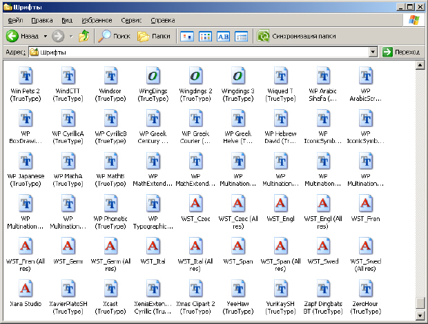 Удобнее всего установить новый шрифт, используя пиктограмму Шрифты в Панели управления, при нажатии на которую открывается окно с перечнем шрифтов, уже установленных в системе (рис. 3.2).