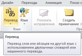 В PowerPoint 2010 имеется встроенный переводчик и можно перевести текст, написанный на другом языке, например фразы или абзацы, отдельные слова или весь файл. Кроме того, можно создать документ на одном языке, а затем перевести его на другой язык с помощью службы машинного перевода Microsoft Translator.