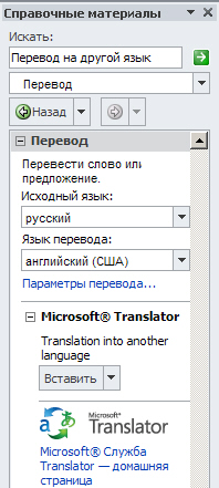 Выполните команду Перевести выделенный текст. Результат перевода появится в области Перевод в разделе Справочные материалы - рис. 3.17.