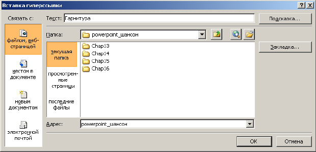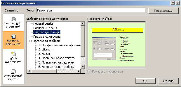 Например, чтобы перейти на другой слайд презентации, нажмите на кнопку местом в документе (рис. 4.12). Найдите и щелкните место назначения, а затем нажмите на кнопку OK.