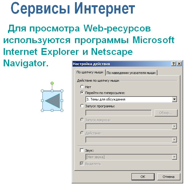 В данном окне для выбора поведения управляющей кнопки при щелчке мыши перейдите на вкладку По щелчку мыши. Для выбора поведения управляющей кнопки при наведении указателя мыши перейдите на вкладку По наведению указателя мыши.