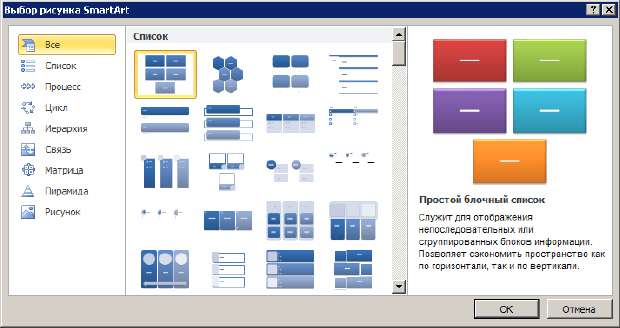 В диалоговом окне Выбор рисунка SmartArt выберите необходимый тип и макет (рис. 4.32).