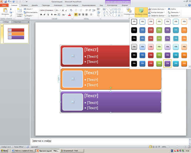 Рисунки SmartArt служат для наглядного представления данных, их можно быстро и легко создать на основе различных макетов, чтобы эффективно донести сообщение или идею. Поскольку графика зачастую воспринимается более эффективно, чем просто текст, то в Office 2010 предлагаются десятки макетов SmartArt, разработанных профессиональными дизайнерами.