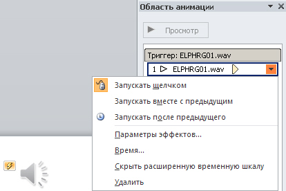 В области задач Область анимации можно установить дополнительные параметры звука. Звук настраивается здесь, поскольку он считается эффектом, сходным с эффектами анимации. Так, здесь можно задать воспроизведение звука во время показа слайдов и затем отключить звук после отображения определенного числа слайдов. Для выполнения подобной задачи сначала откройте область задач Область анимации (вкладка Анимации, команда Область анимации) - рис. 5.4. Звуковой эффект, вставленный на слайде, представляется в области задач данного окна именем звукового файла. В нашем случае имя звука - ELPHRG01.wav.